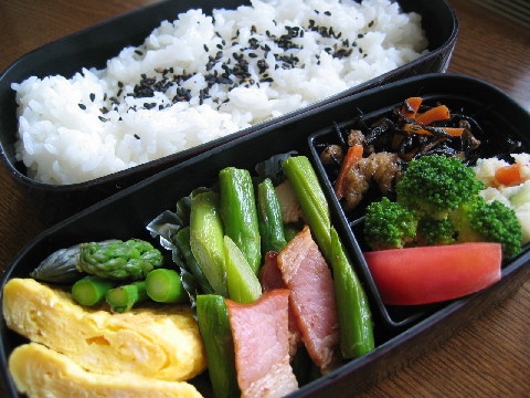 ◆玉子焼き アスパラベーコン アスパラサラダ 五目ひじき ブロッコリー トマト ポテトサラダ 白米 黒ゴマ