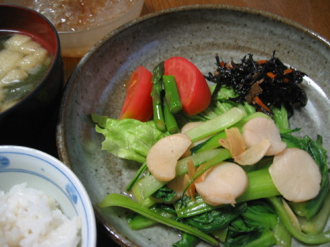◆ホタテと青梗菜の塩炒め トマト アスパラ 五目ひじき ところてん 油揚げと小松菜のお味噌汁 麦入りごはん
