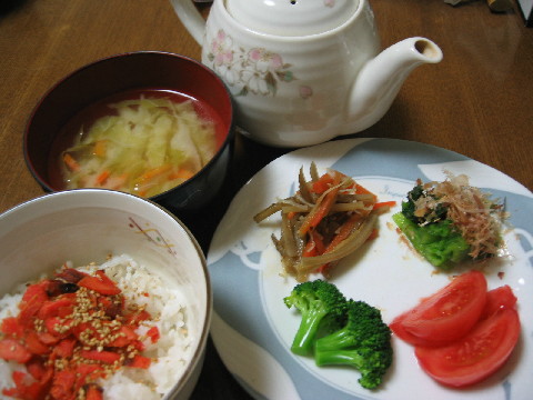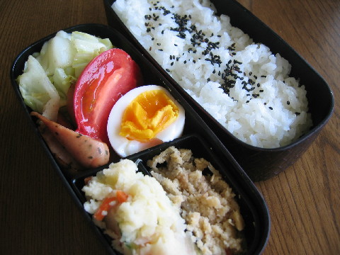◆キャベツとウインナーの炒め物 トマト ゆでたまご 五目おから ポテトサラダ 白米 黒ゴマ