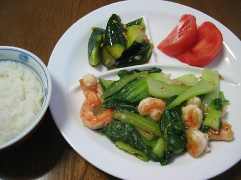 ◆青梗菜とエビの塩炒め たたききゅうりのごま風味漬け トマト 白米