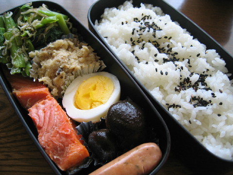 ◆小松菜としらすの炒め物 五目おから ゆでたまご 椎茸の煮物 ウインナー 紅鮭 白米 黒ゴマ