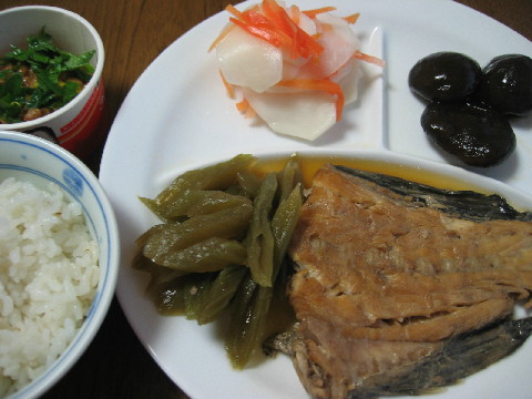 ◆お魚の煮付け(ソイ) フキの煮物 椎茸の煮物 かぶと人参の酢の物 納豆(シソ入り) 麦入りご飯