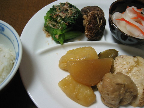 ◆煮物 かぶと人参の酢の物 小松菜のおひたし 焼き椎茸 麦ごはん