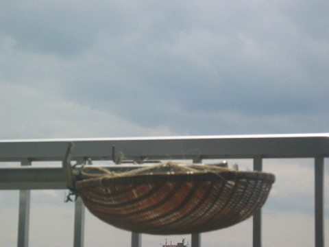 仕方ないので竹ザルに紐を通して物干し棒に干してみた。