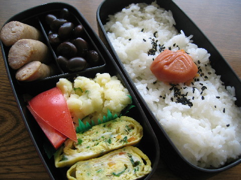 ◆ニラと人参の玉子焼き ポテトサラダ トマト 黒豆 ウインナー 白米 梅干し 黒ゴマ