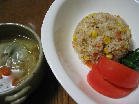 ◆しらす入り炒飯 トマト ニラのおひたし ワンタンスープ(餃子・白菜・人参)