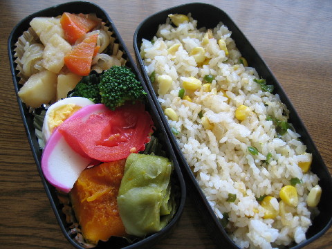 ◆炒飯 肉じゃが(残り物) ブロッコリー ゆでたまご トマト かまぼこ カボチャとインゲンの煮物
