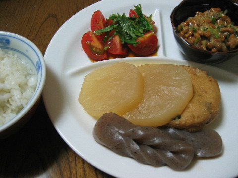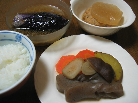 お昼は友人とランチのため、 夫のお弁当のみ作りました。 今日の晩ごはん 煮物&煮物(おでん)です^^; ◆煮物(冷蔵庫にある物いろいろ こんにゃく ごぼう しいたけ 人参 サツマイモ) おでん(昨日の残り物) 茄子の揚げびたし 白米