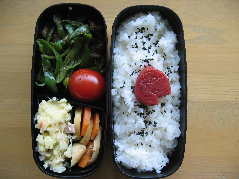 今日のお弁当 週末に買い物に行ったらピーマンが1袋50円♪ 嬉しいですね^^ ◆ピーマンと牛肉の炒め物 プチトマト タケノコと人参の煮物 ポテトサラダ 白米 梅干し 晩ごはん 今年初の鍋焼きうどんです。 おいしかった~♪ ◆鍋焼きうどん カボチャの煮物