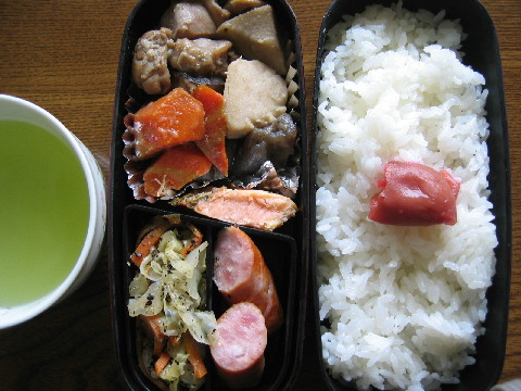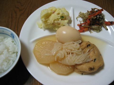 今日のお弁当 昨日の煮物の残りです。 ◆筑前煮 紅鮭 ウインナー キャベツと人参の胡麻和え 白米 梅干し お茶 晩ごはん 寒い日はおでんがおいしい。 ◆おでん ポテトサラダ キャベツと人参の胡麻和え(朝の残り物) 白米