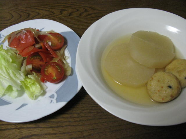 大根とがんもの煮物 プチトマトとサーモンのマリネサラダ