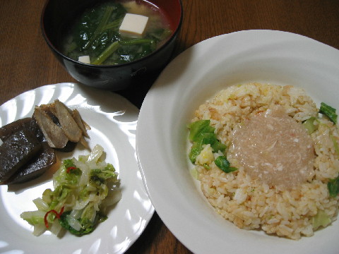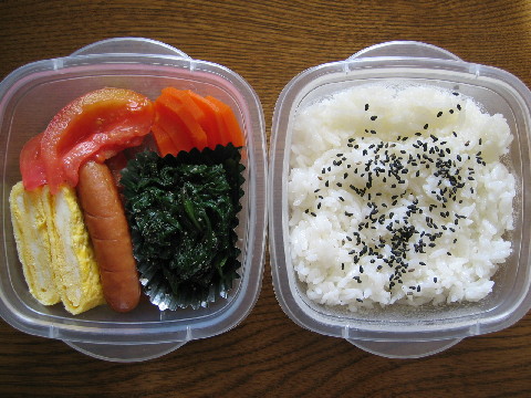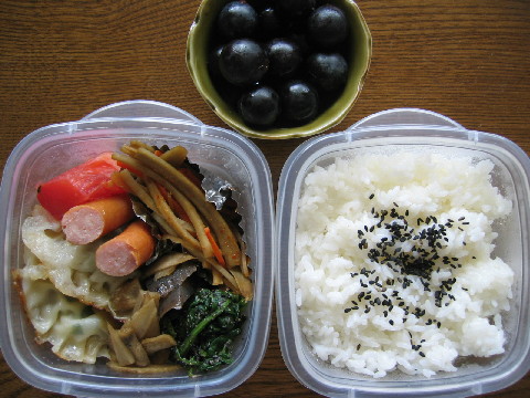 今週もお弁当頑張りました^^ 今日のお弁当 残りもの弁当です。 先週作った餃子の残りを冷凍しておいたので、それを焼きました。 ◆焼き餃子 ホウレン草の胡麻和え キンピラごぼう ウインナー トマト 白米 黒ゴマ 葡萄 晩ごはん カに缶を買ってきてあんかけ炒飯を作りました。 私が食べたかったんです^^ ◆あんかけ炒飯(レタス入り) 白菜の甘酢漬け コンニャクとごぼうのいり煮 お味噌汁(ホウレン草 豆腐)