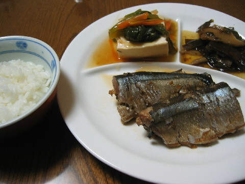 ◆秋刀魚の甘辛煮 ◆あんかけ豆腐(ニンジン・青菜) ◆昆布としいたけの煮物 ◆白米