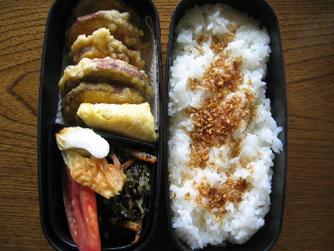 ◆サツマイモの天ぷら ◆卵焼き ◆キャベツと人参の胡麻和え ◆ちくわ・紅鮭 ◆白米・ふりかけ