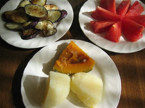 ◆ジャガイモとかぼちゃの塩煮 ◆茄子のバター炒め ◆トマト