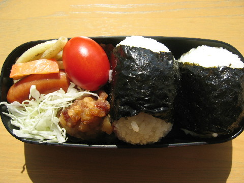 ◆おにぎり ◆唐揚げ(惣菜の残りもの) ◆マカロニサラダ ◆ウインナー ◆トマト キャベツの千切り