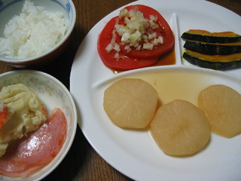 ◆大根の煮物 ◆トマト&玉ねぎ ◆かぼちゃのソテー ◆ポテトサラダ&ハム ◆白米