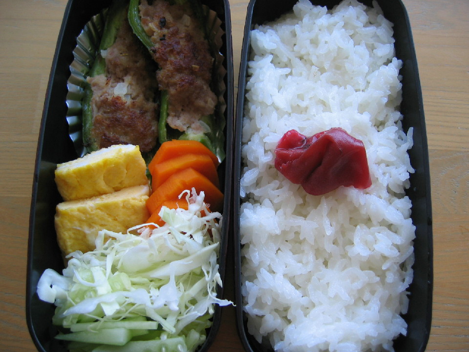 ◆ピーマンの肉詰め ◆人参の甘煮 ◆玉子焼き ◆キャベツときゅうりの千切り ◆白米・梅干し