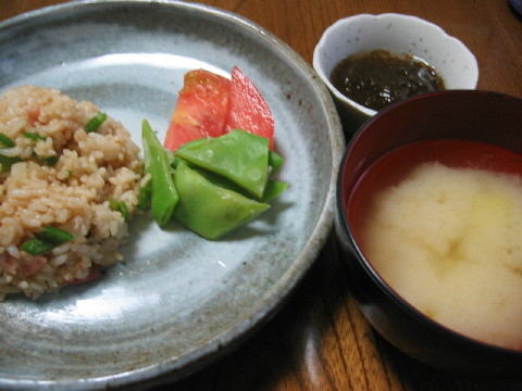 ◆炒飯 ◆いんげんとトマトのサラダ ◆もずく酢 ◆お味噌汁(ジャガイモ)