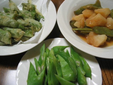 ◆モロッコいんげんの天ぷら ◆新ジャガといんげんの煮物 ◆いんげんのサラダ ◆白米
