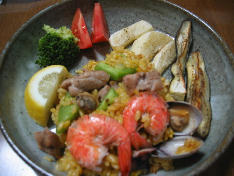 お昼ごはん 今年何度目?冷やし中華です。 ◆冷やし中華 晩ごはん 久しぶりにパエリアを作りました。 アサリ・えび・パプリカ・鶏肉などが入っています。 盛り付けはイマイチですが^^;、味はよかったです^^ レモンをギューっとしぼっていただきました。 サフランがあるのでまた作りたいと思います。 ◆パエリア ◆ジャガイモ・茄子のオリーブオイル焼き ◆トマト・ブロッコリー