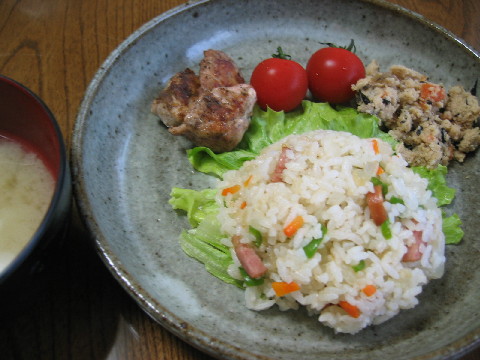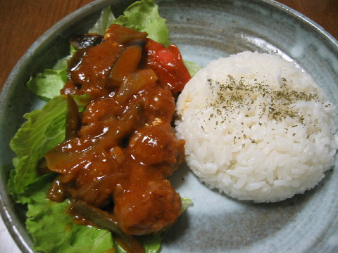 お昼ごはん 肌寒いので、温かい麺でも全然暑くないです。 ◆うどん(ごまうどん、ネギ) 晩ごはん 今日は創作料理。 実は創作料理は毎回評判悪いんです^^; 冷凍庫を見たら挽き肉発見。 煮込みハンバーグではなく、煮込みミートボールを作りました。 夏野菜をいろいろと、ミートボールの中にチーズを入れてみました。 意外とおいしくいただけました。 今回は評判がよかったです。でもきっともう作らないだろうな~ ◆煮込みミートボール&夏野菜 レタス ◆白米・乾燥パセリ