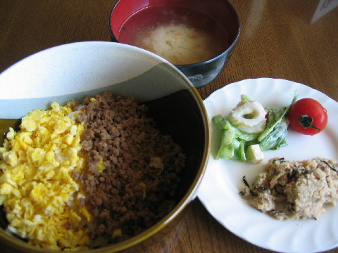 ◆2色丼(たまご・挽き肉) ◆サラダ・プチトマト・おから ◆お味噌汁(玉ねぎ・人参)