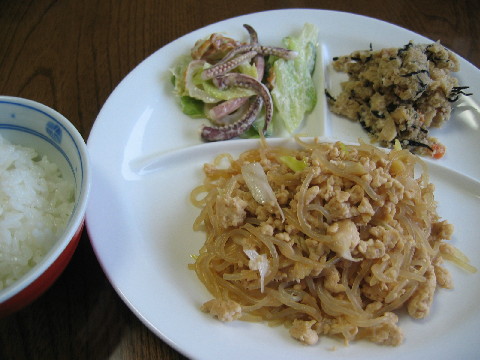 ◆シラタキと鶏挽き肉の炒め物 ◆イカげソサラダ ◆おから ◆白米