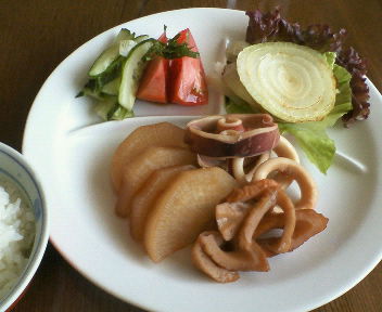 ◆イカ大根 ◆焼き玉ねぎ・レタス ◆トマト・きゅうり・シソのサラダ ◆白米