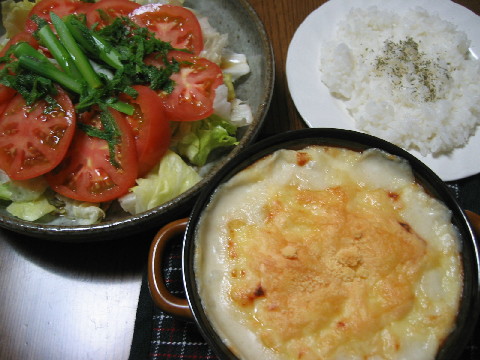 ◆アスパラと玉ねぎのグラタン ◆トマト・シソ・アスパラ・レタスのノンオイルサラダ ◆白米 乾燥パセリ