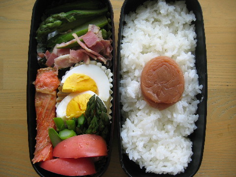 ◆アスパラとベーコンの炒め物 ◆ゆでたまご ◆紅鮭 ◆アスパラ・トマト