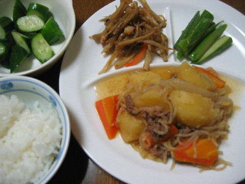 おかずは昨日の残りの肉じゃとその他野菜が中心です。